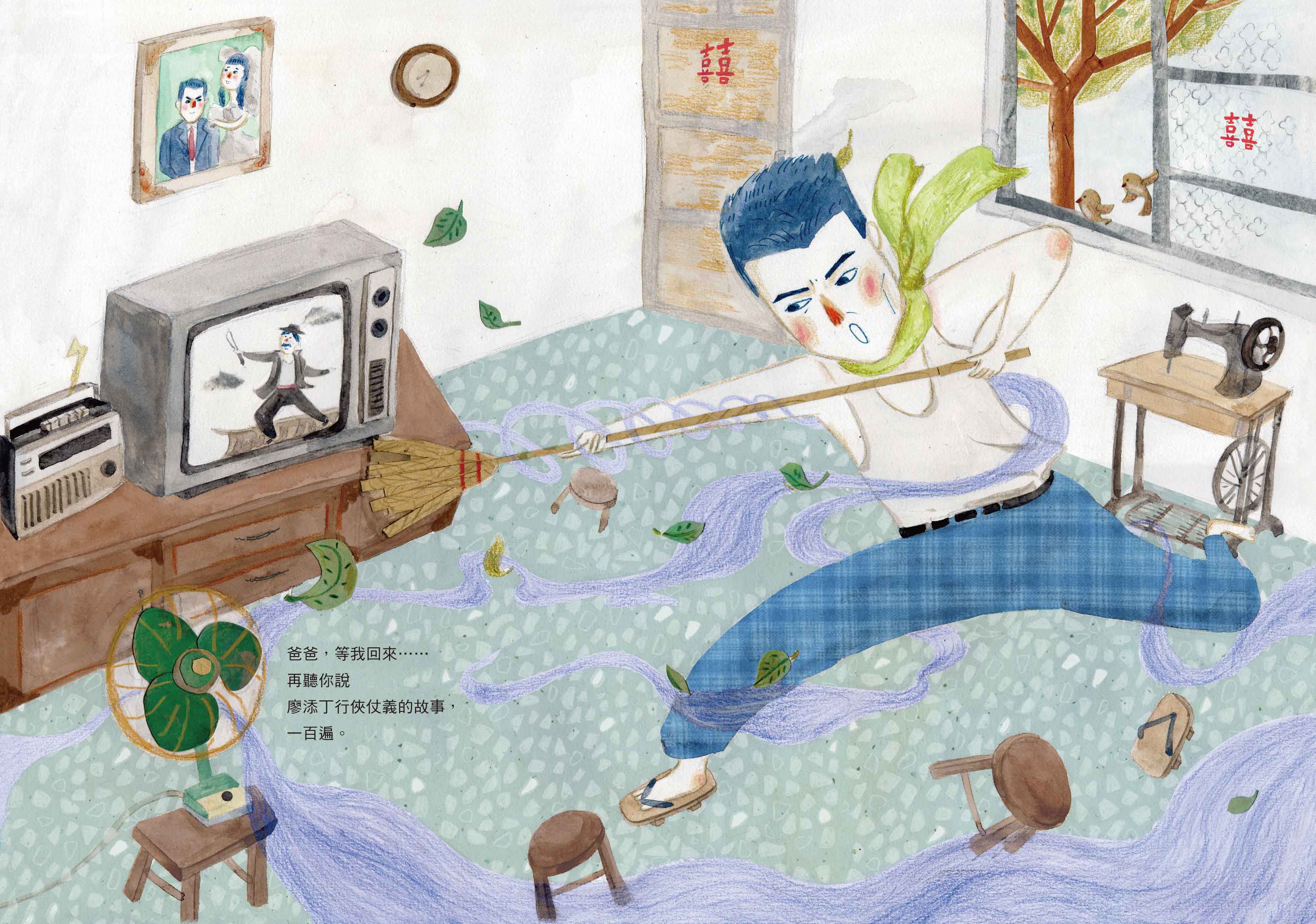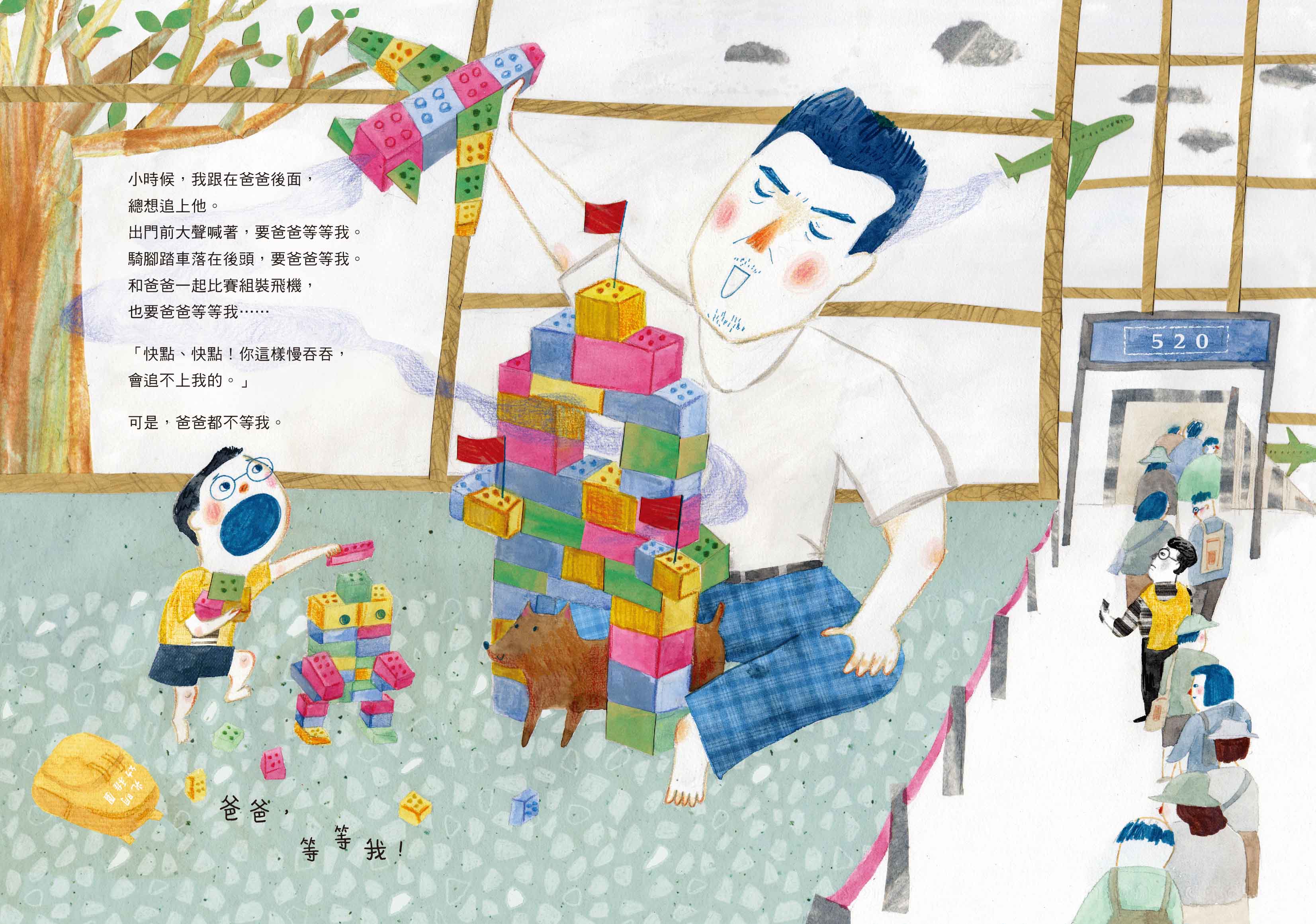 記得作者粘忘凡來到公司,跟我們講述這個故事的時候,大家聽完都非常有感觸。因為這個故事正代表了現在在職場上衝刺的我們,內心深處的擔憂。「爸爸,等等我!」小時候說這句話時或許沒有太深的情緒,但當家人開始老去,需要被照顧時,一回頭才發現,現在我們希望「爸爸,等等我!」,這句話帶了多少的期待和不想失去的遺憾。在合作的過程中,發現作者和繪者對於這本書的用心,是超過我所想像的,因為要呈現出「爸爸,等等我!」這句話在不同時候說有不同的心情,把對比感拉出來,作者在角色、年代和場景設定上都下足功夫;而畫面由現在到過去,再從過去到現在,穿越時空的呈現,要如何讓讀者理解,更是不容易。而為了符合整個時間軸線,從大環境到家具,甚至是電視畫面等等,都經過仔細的研究和討論,讓整個氛圍更濃厚,讀起來更有感覺。一句「爸爸,等等我!」有如此豐富的情感,在這句話的背後,是兒女們渴望有多一點時間陪伴父母的心情。珍惜身邊所有的,讓時間不再只是逝去,而是能創造更多回憶。