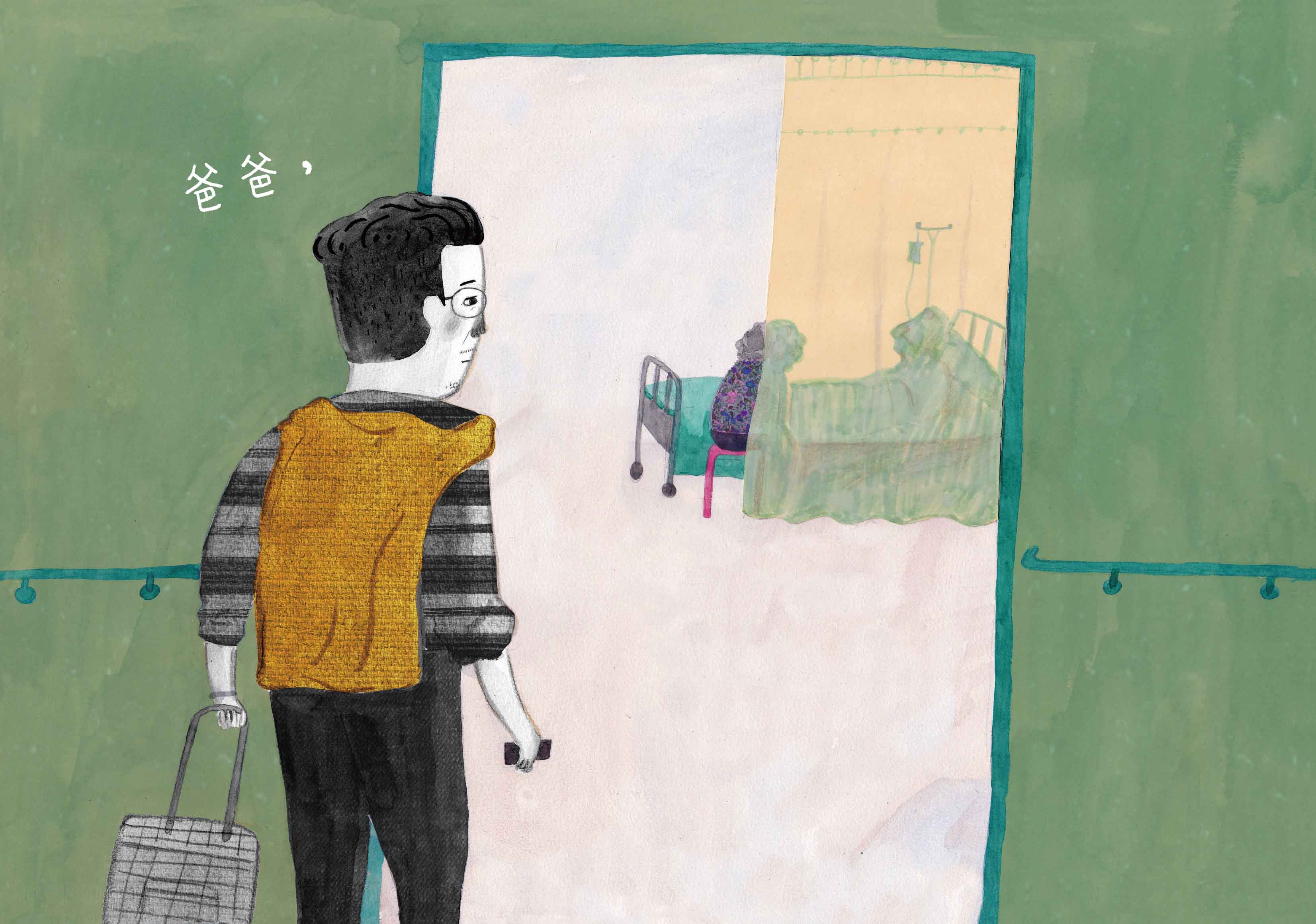 那一天,我從醫院探望又一次從加護病房回到一般病床的父親,離開醫院後幾天,我寫下了這個故事。小時候的追趕、成年後的哄騙,想跟在父母親身邊的盼望,希望他們能等等我們的心情,卻變得複雜而沉重……