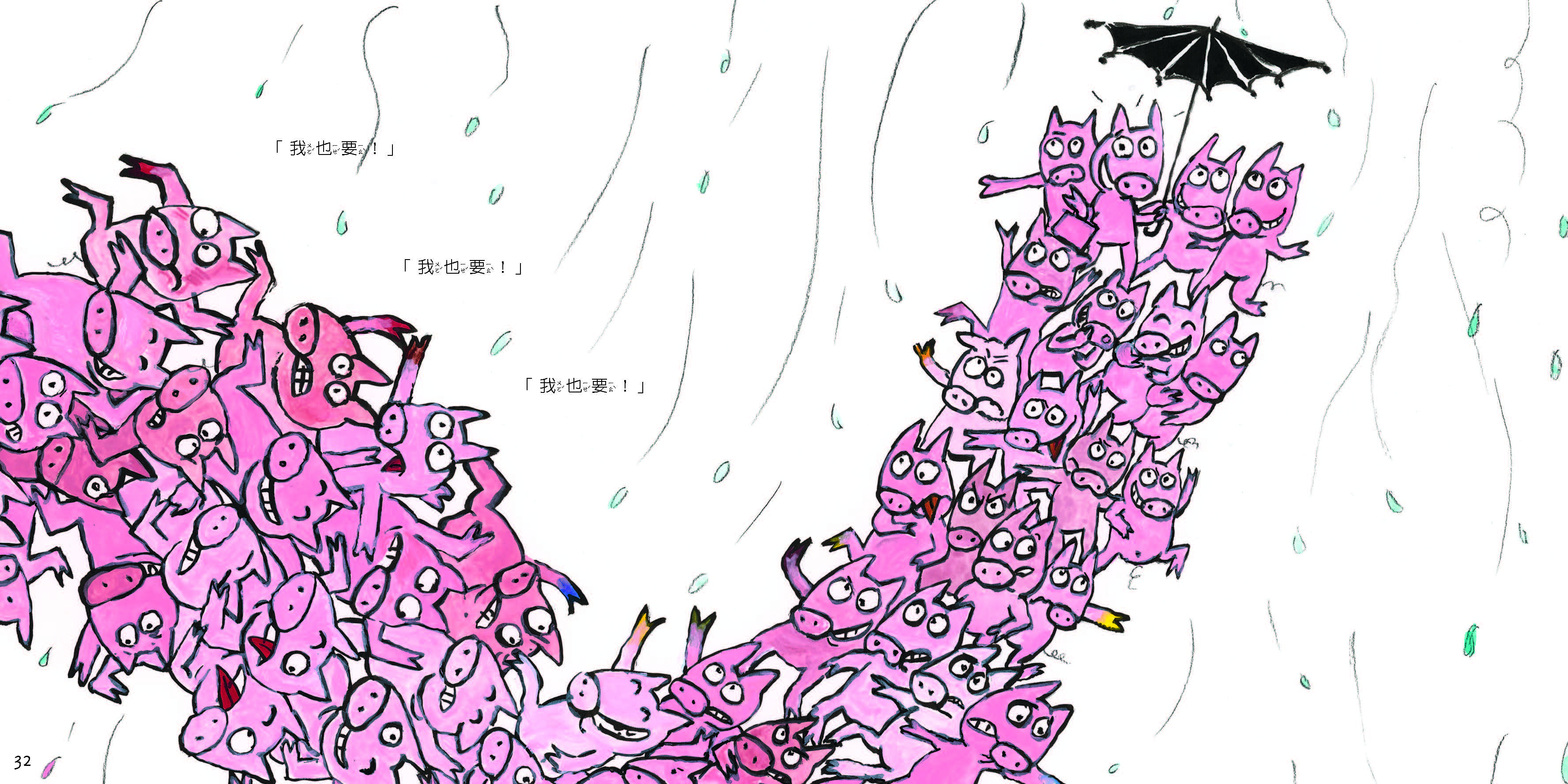 當面臨自我和主流價值的衝突時,你會怎麼做呢?在繪本中,艾加面臨了衝突中三種常見的狀況。第一種,同時也是最普遍的一種,就是改變自己以順應主流期待,從而獲得接納。於是小黑豬艾加把自己的一身黑皮塗成粉紅色,成為一隻「普通」、「正常」的小豬,果然也因此得到同儕的擁抱。但丟棄了原本的自己、就能真正得到快樂嗎?狹窄的審美定義一旦和自信畫上等號,隨之而來的就是對自我認同的不安全感──什麼時候,我又會因為超出主流框架而被排斥呢?是不是擁抱自己的特別之處,才能用真正舒服的姿態生存在社會中?