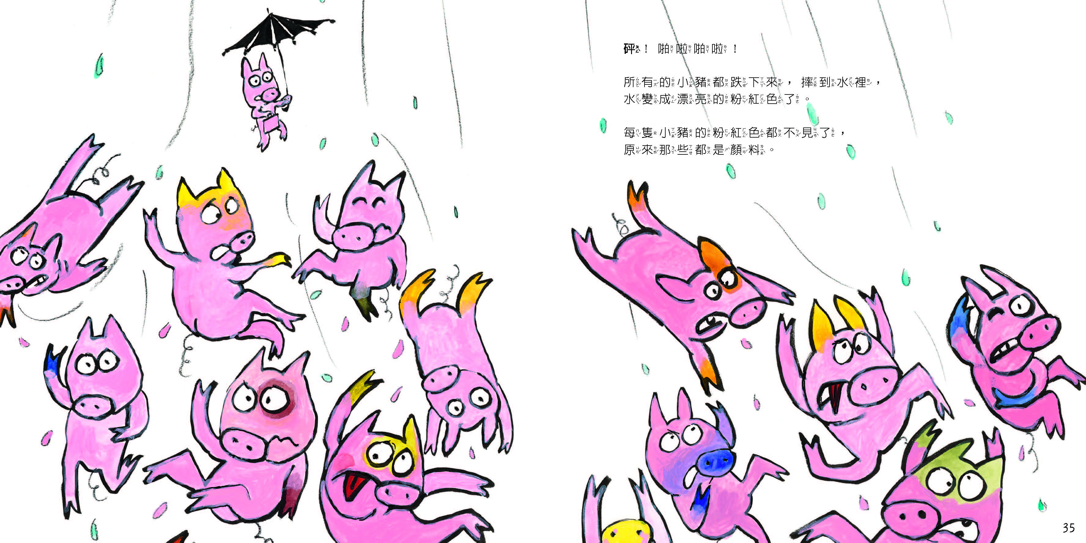 而在故事末尾,讀者們才發現原來這群「粉紅豬」也不是真正的粉紅豬,而是塗了顏料的「彩色豬」!這群彩色豬曾經也是被主流排拒的一群,好不容易透過彩繪顏料而被主流團體接納,卻反過頭來排斥同樣「非主流」的夥伴。這樣的關係在校園中亦不少見,角色翻轉後,曾經的被霸凌者也可能搖身一變成為霸凌者──但這些人難道不是最能同理被排斥的心情嗎?好在故事有了一個色彩繽紛的結局,大家都願意面對自己最真實的樣子,也願意接納彼此,五顏六色的小豬們終於開心地玩在一起。