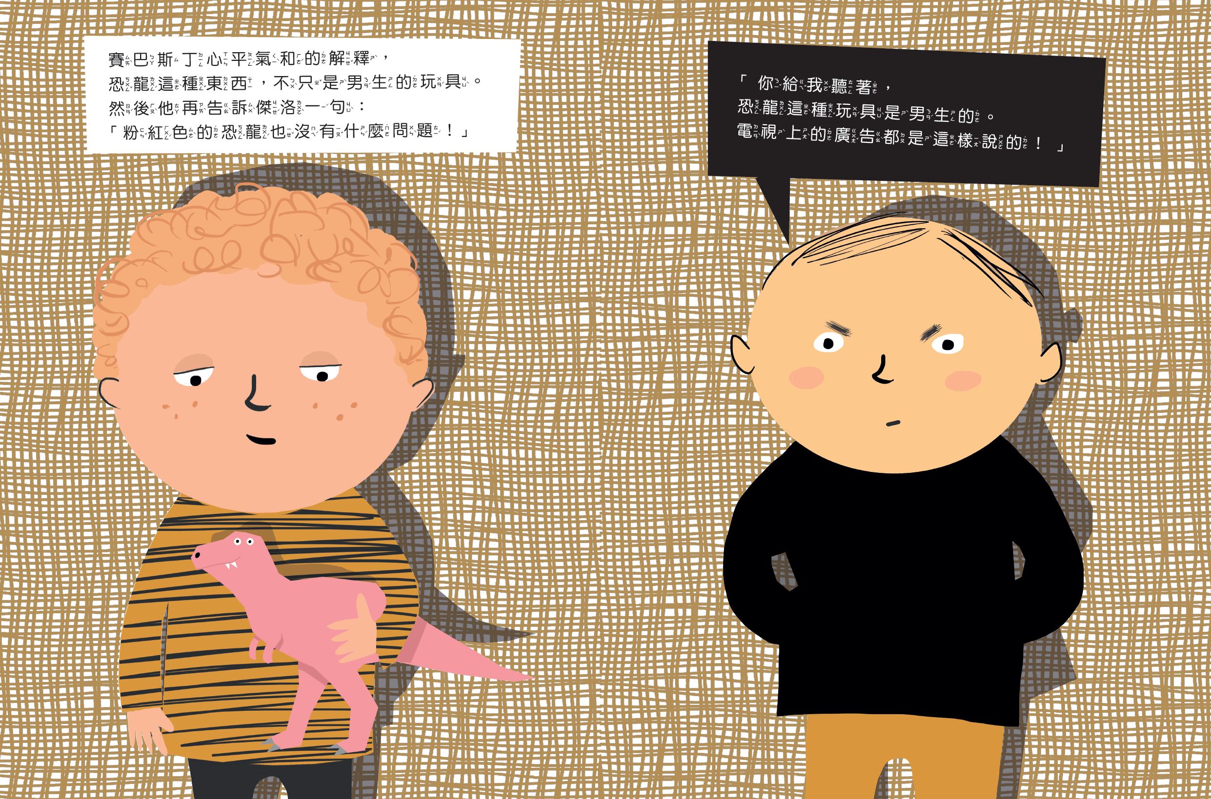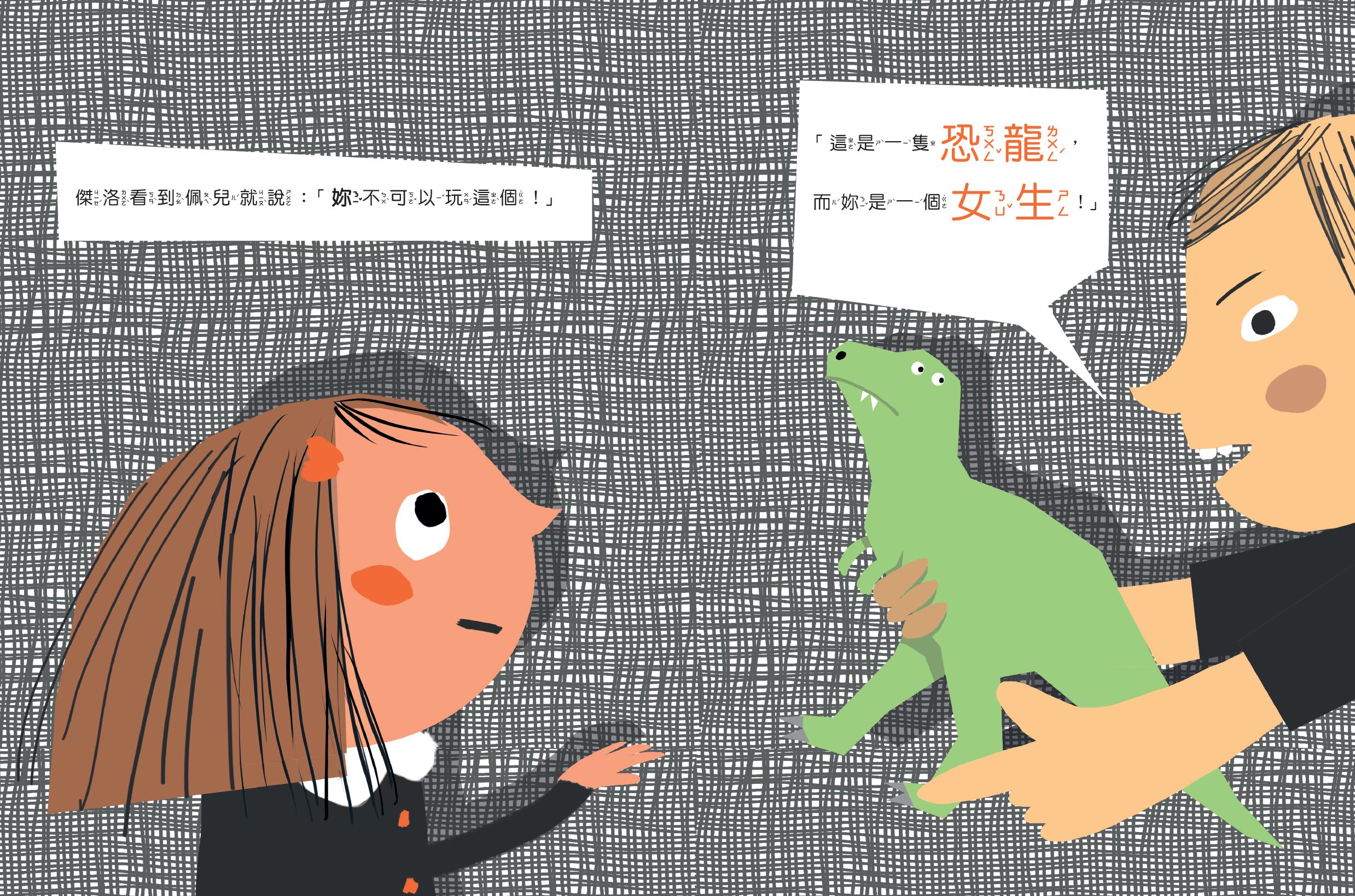 然而,不是所有人都像賽巴斯汀ㄧ樣具有性平的概念。鄰居男孩傑洛來找佩兒及賽巴斯汀一起玩時,說:「佩兒,妳是女生,妳不可以玩恐龍!」也許有人會認為,只是一句話嘛,有什麼大不了的?可是,這樣的語言歧視,可能會造成傷害並留下長年的心理陰影,語言的傷害,並不比行動來得小。幸好,佩兒有足夠的自信,她對抗歧視的方法不是罵回去或打回去,而是用幽默的方式反將一軍:把傑洛的恐龍漆成粉紅色。傑洛氣壞了,因為他覺得粉紅色是女生的顏色,賽巴斯汀卻告訴他:「粉紅色的恐龍也沒有什麼問題!」