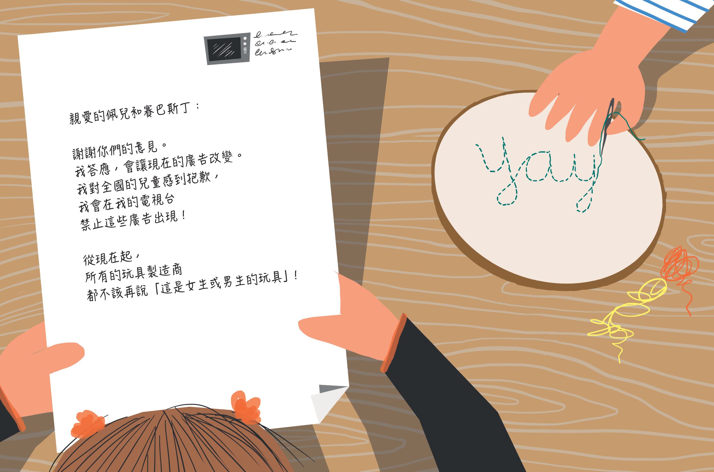 他們發現,傑洛的性別刻板印象是從電視廣告來的,於是決定改變這個大環境。他們寫信給電視台,而電視台也回信了,承諾以後不會繼續在電視台上播放帶有性別刻板印象的廣告,因為「玩具是不分性別的。」
