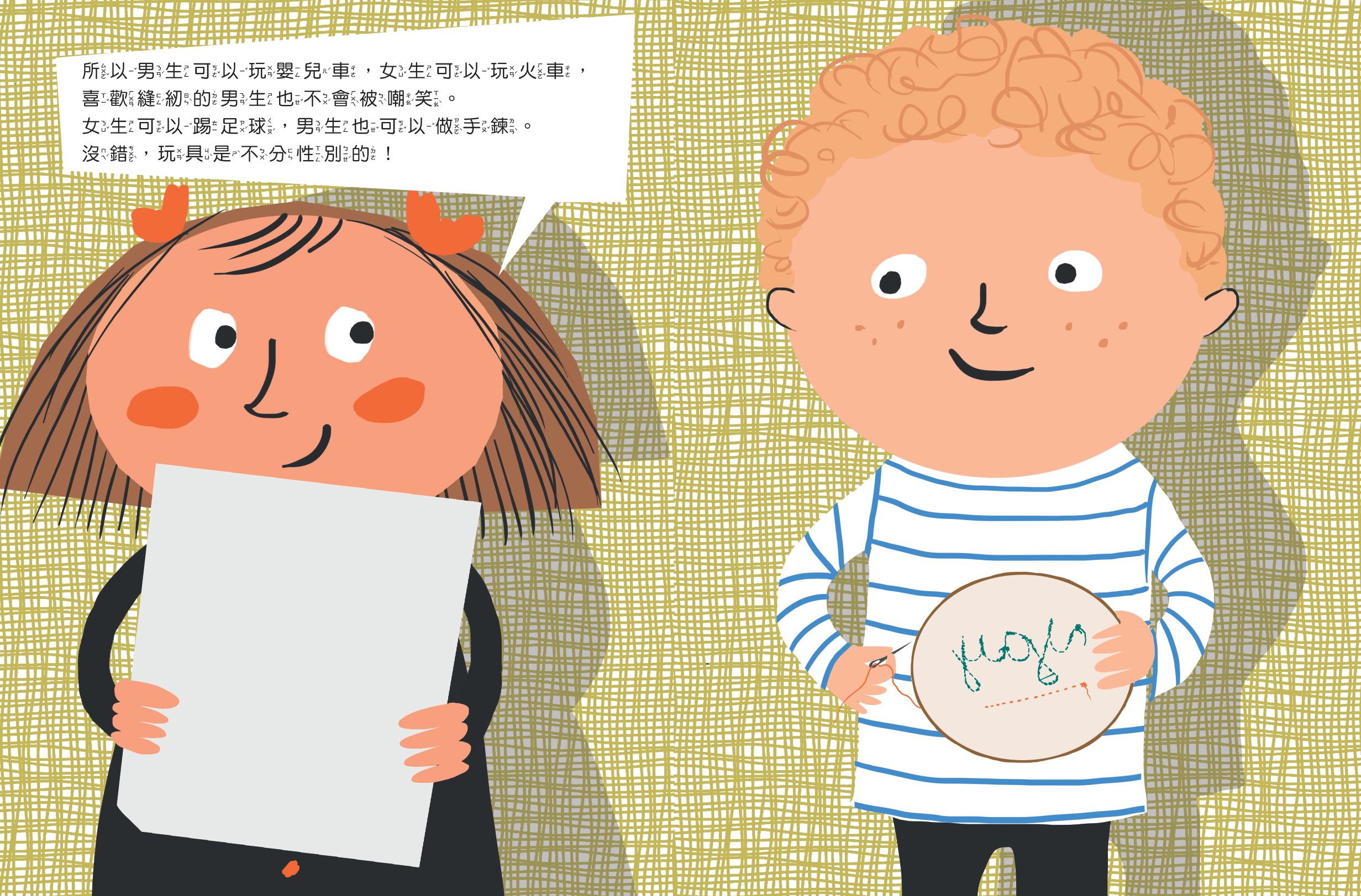 《誰說這是男生的玩具!》提供讀者寬廣的性別平權思考,期待未來有一天,我們的孩子要購買機器人、遙控飛機、絨毛玩偶,選擇的前提將會是「合不合適」而不是「男生或女生的」。