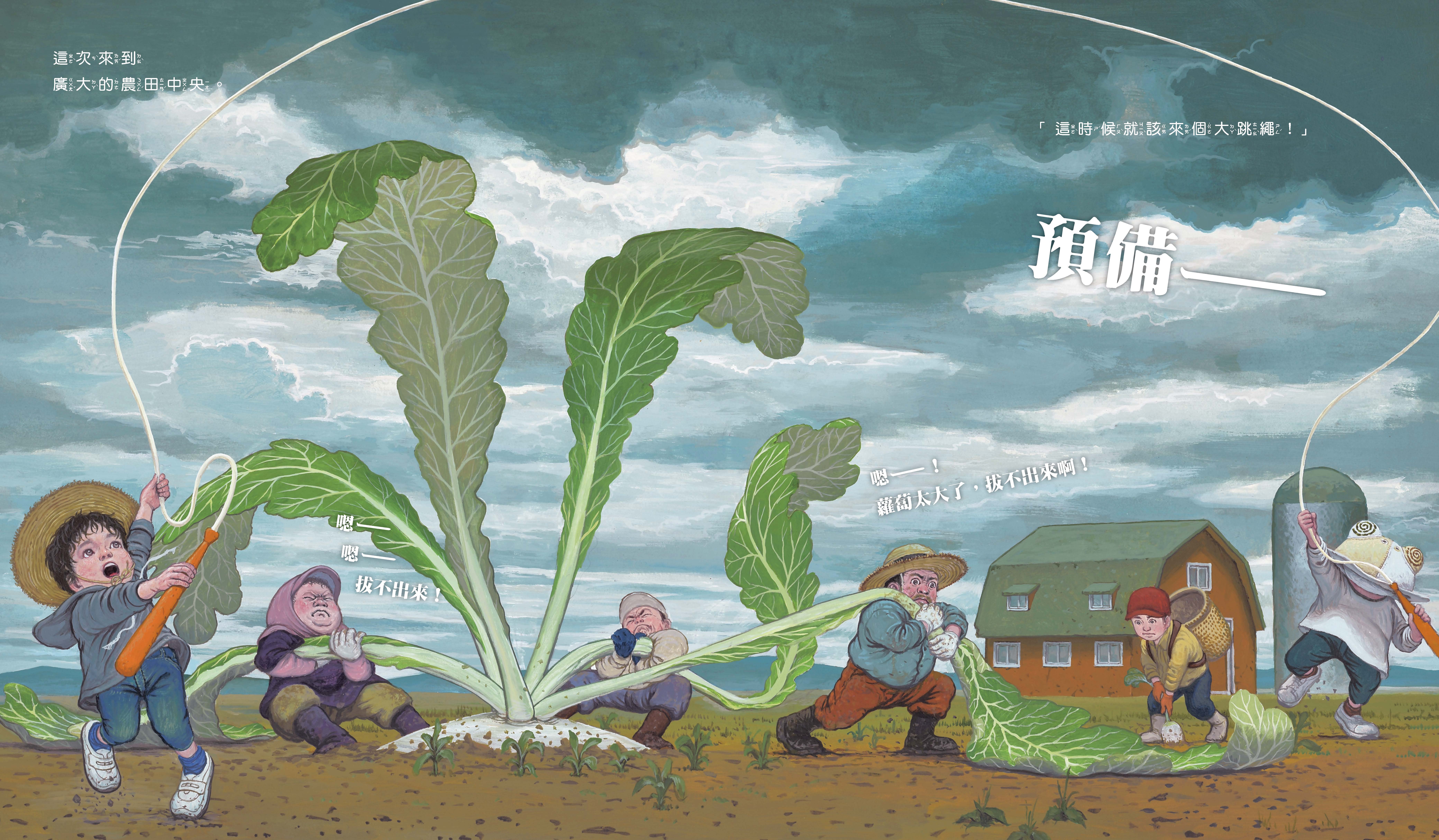 不會跳繩的阿健,面對氣勢凌人的阿清……正當我以為這是討論霸凌的繪本時,沒想到一個轉角就遇到奇幻。「如果不會跳繩,只會轉繩子,那就負責轉繩子吧!」戴著帽子的神秘男子說。這是一條魔法跳繩,不管是誰都會忍不住加入,而且絕對不會卡住絆倒。如同《這是誰的內褲》一般,作者擅長從現實生活開始,慢慢堆疊不可思議的成分。一開始是很多老人的公園,相當正常,但下一秒老人們居然整齊畫一,生龍活虎的跳起繩來,正當讀者還在思考這可能性有多高之際,作者已經迅速進入下一個情境,絲毫不給讀者喘息的機會,乾坤大挪移到田中間,主角換成拔不出來的巨大蘿蔔。魔法跳繩一揮,蘿蔔就「露出臉來」。翻譯時因為PDF只有單頁,所以我翻成「終於拔了出來」,但看到下一頁,真的是「露臉」啊!蘿蔔長臉,這肯定比老人跳繩更加不可思議了。
