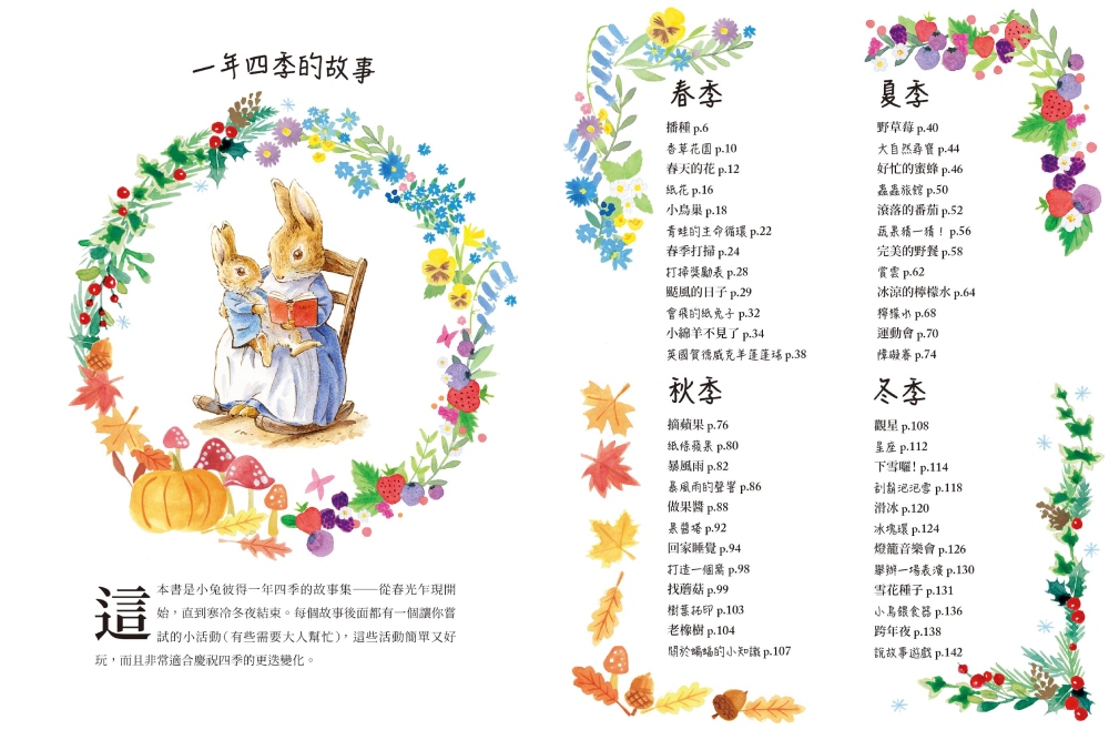 ★本書從碧雅翠絲•波特創造的世界中,依時序變化延伸出24個全新的故事和有趣的活動,小兔彼得和他的動物朋友們,在四季遞嬗裡與自然共生同樂,讓我們也想跟著他們的腳步,展開驚奇的探索和冒險。