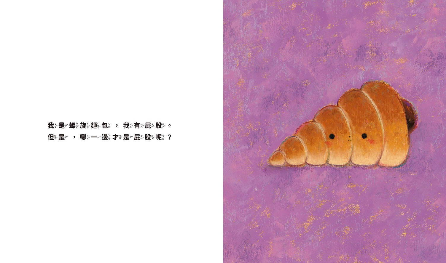 《螺旋麵包的屁股是哪一邊?》這樣奇怪的提問,卻能啟發孩子們從有趣的視角看待生活中的小細節,發掘看似平凡卻充滿玄機的日常事物。(特別是美味的麵包!)
