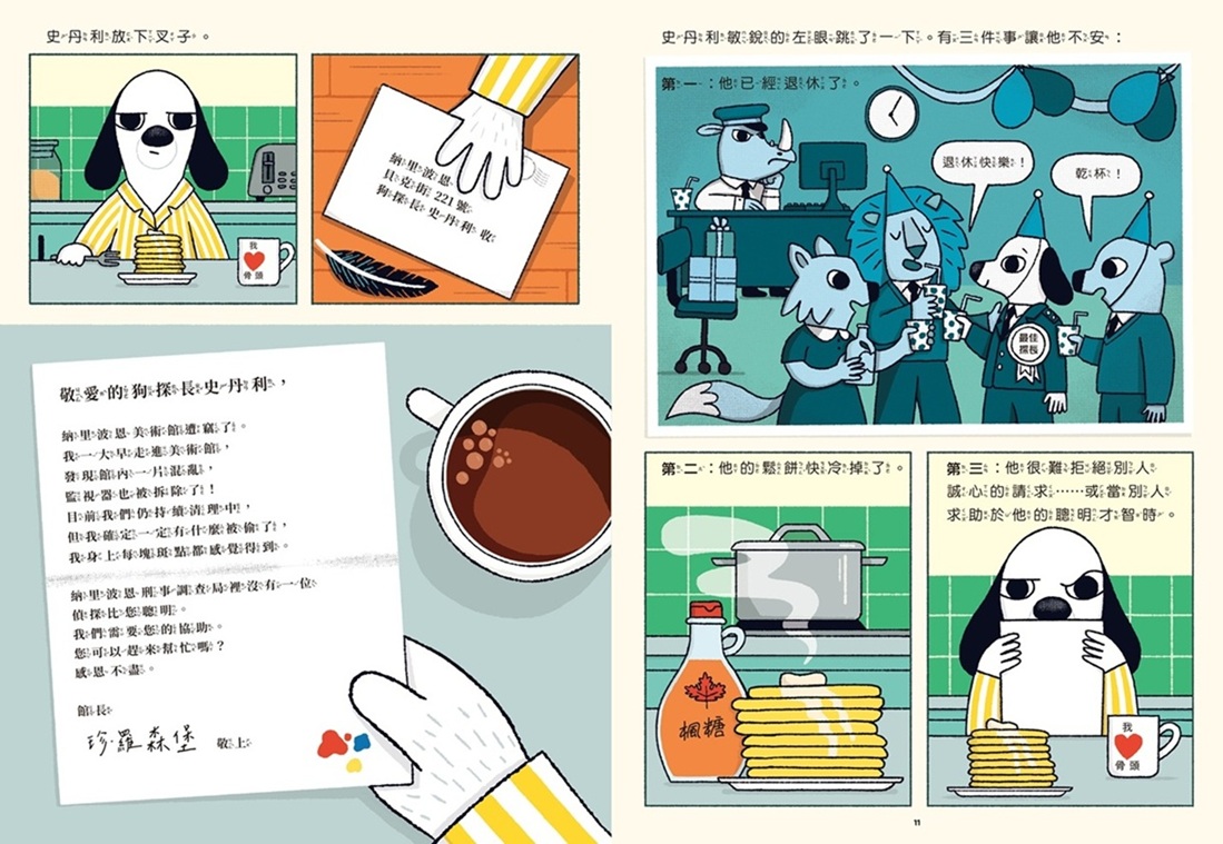 狗探長史丹利是超可愛的偵探入門圖像小說!每頁的圖像格數恰到好處,不會看起來雜亂。我最喜歡的畫面是監獄那部分——它就像理察‧斯凱瑞的作品一樣,劇情推進很快,小朋友很快就能看到令人滿意的結局。這本書讀起來就像是對懸疑小說黃金時代的全新致敬。我也很喜歡書末關於藝術家蒙德里安真實作品的補充知識。——goodreads網友Laura