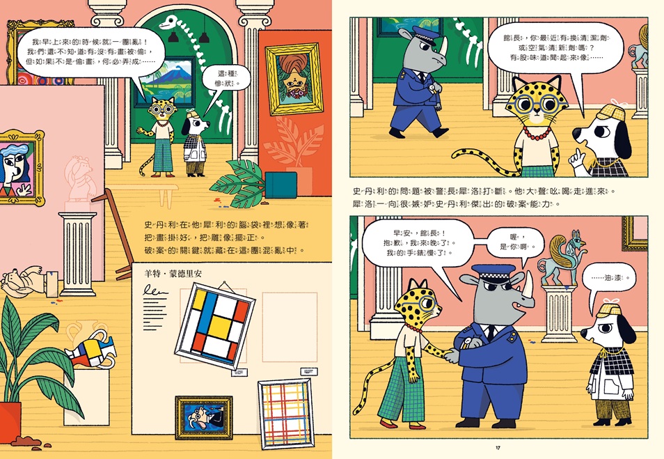 作者也鋪陳了一個聲東擊西的疑點,讓人懷疑栽贓狗探長的是犀洛。犀洛嫉妒,又謊稱手錶不準時,都讓聰明的小讀者去推理判斷。書中還有許多細節,我們不妨引領孩子觀察思考,比如,有沒有發現狗探長家也有一幅蒙德里安?狗探長是何時把帽子脫下,讓壞人有機可乘?狗探長有哪些工具?他用工具做了什麼?美術館裡還有畢卡索、梵谷和維梅爾的名畫,找得到嗎?有沒有看到有人正在逃獄?狗探長的床頭照片是哪一幕景象呢?犀洛也出現在退休的慶祝會上哦!