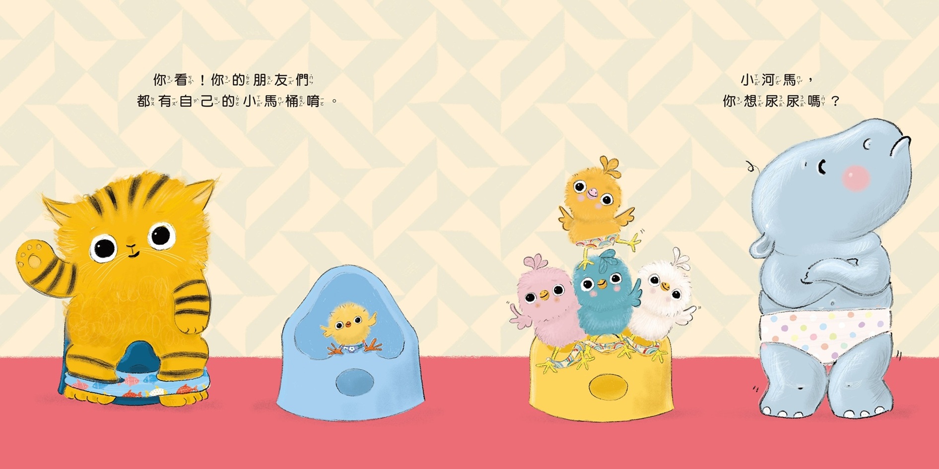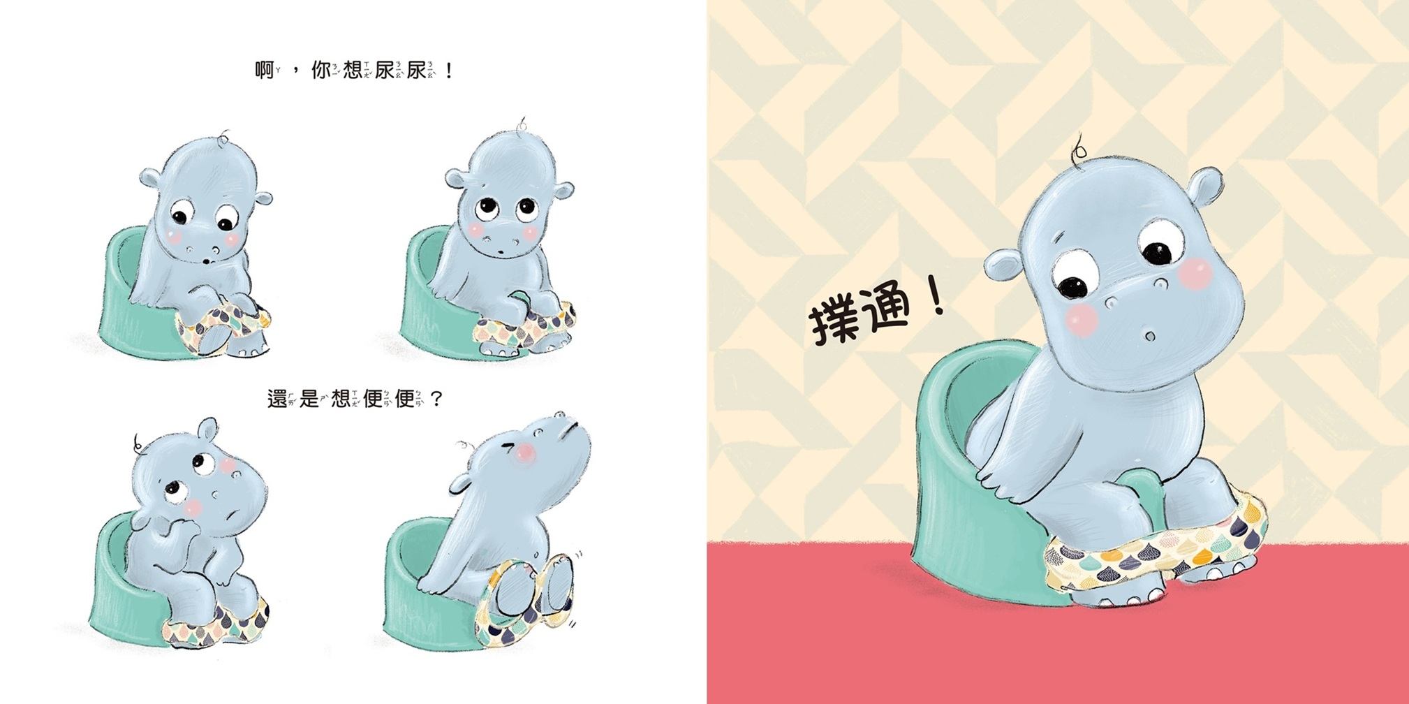 小河馬練習用小馬桶的過程更是凸顯孩子在所有學習中主動抉擇、試探與融合固有經驗的整段經歷。小河馬一收到小馬桶時,還不想用小馬桶來上廁所。他把小馬桶當成新玩具,拿來種花、用來當戲水池,還把一堆玩具通通丟進去。敘事者溫柔地提醒小河馬:你的好朋友們也都有自己的小馬桶呀!可是小河馬還是不想馬上用小馬桶尿尿和便便,他繼續玩個不停,玩到不小心尿在褲子上了,敘事者依然耐心對待尿濕褲子的小寶貝,而且不但不責怪,還鼓勵孩子:沒關係唷!只要換褲子就可以啦。於是小河馬自己脫下尿溼的褲子,自己拿出抽屜裡乾淨的褲子換好。整段過程成人都沒有催促,也不責罵,等到孩子身心都準備好,自然就會像書裡的小河馬一樣,用小馬桶來上廁所。而且也別忘了繼續鼓勵孩子生活自理的成功經驗喔,像小河馬,就得到三顆星星呢!