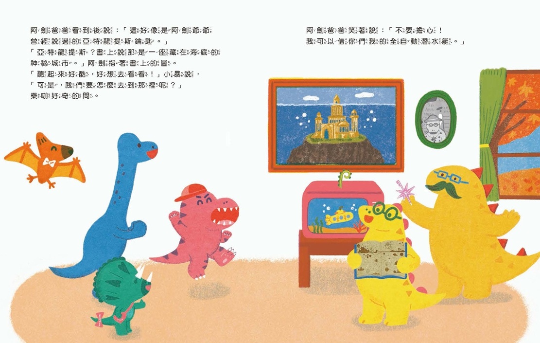 這群繽紛又調皮的小恐龍再次展開冒險!這次他們潛入神祕的海底世界,追尋傳說中的亞特龍提斯。歷經亂流與恐懼,卻在彼此扶持中找到真正的寶藏。透過咚東充滿童心的筆觸描繪出奇幻深海,帶領孩子潛入一場充滿勇氣與友情的視覺饗宴。