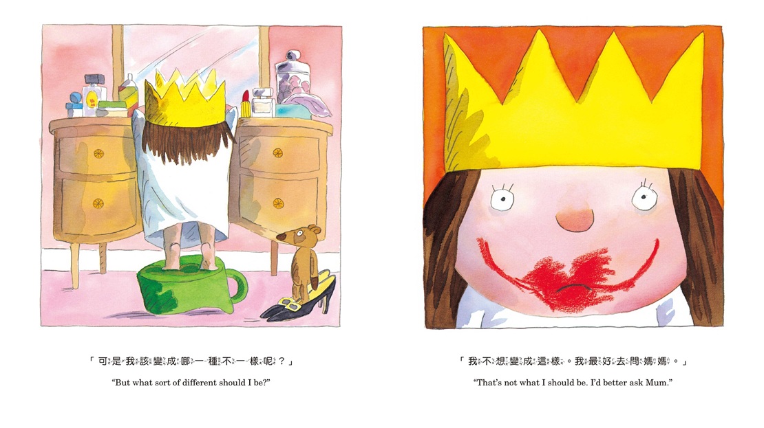 Tony Ross筆下的小公主,讓我想起我的小女兒,身子小小的,但有一顆大大的心。故事幽默又寫實,小公主在各種鬧脾氣和試錯中,體悟到成長的道理,就像現實人生中的每一天。中英對照簡單易懂,適合親子共讀,孩子一定會很有共鳴。——Sandy采聿老師/「聽故事學英文」Podcast主持人