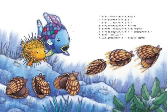 彩虹魚最喜歡撿海底的藍色小石頭,但是颱風就要來了!果然,大風大浪將彩虹魚帶到一個不知名的地方,彩虹魚迷路了!於是開始請大家幫忙。一路上有很多的好朋友,他們都願意幫忙彩虹魚找到回去的路。最後,終於在最老的條紋魚的幫忙之下,回到有藍色小石頭的地方,也順利的找到他的那群閃閃發亮的好朋友。