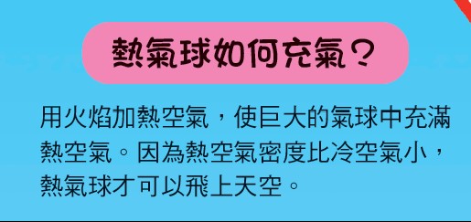 「用火焰加熱空氣,使巨大的氣球中充滿熱空氣。因為熱空氣密度比冷空氣小,熱氣球才可以飛上天空。」